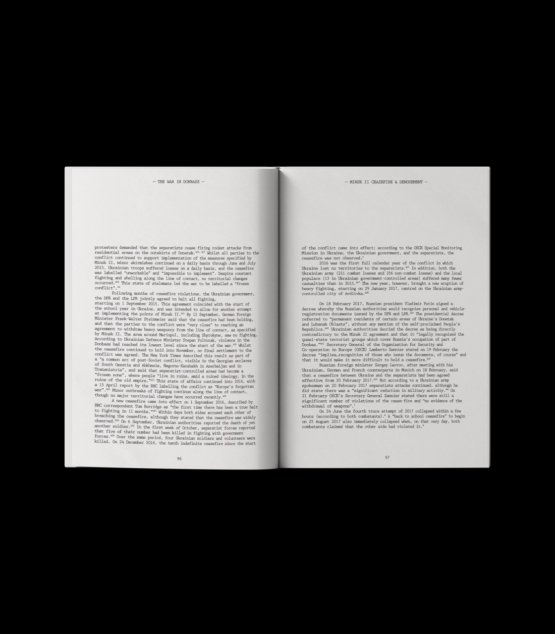 The War In Donbass is a typographic exploration into the annexation of the region of Donbass in Ukraine, by the Russian government. The book is designed in a progressive and exponential manner in that as the reader flips the pages, the text slowly creeps up. As each chapter progresses, the text rises to showcase this feeling of annexation. Moreover, this adds to the exponential nature of war–as the more time it takes, the worse the effects are, and they multiply. As the chapters progress, they get shorter and shorter as more text fills up the space.