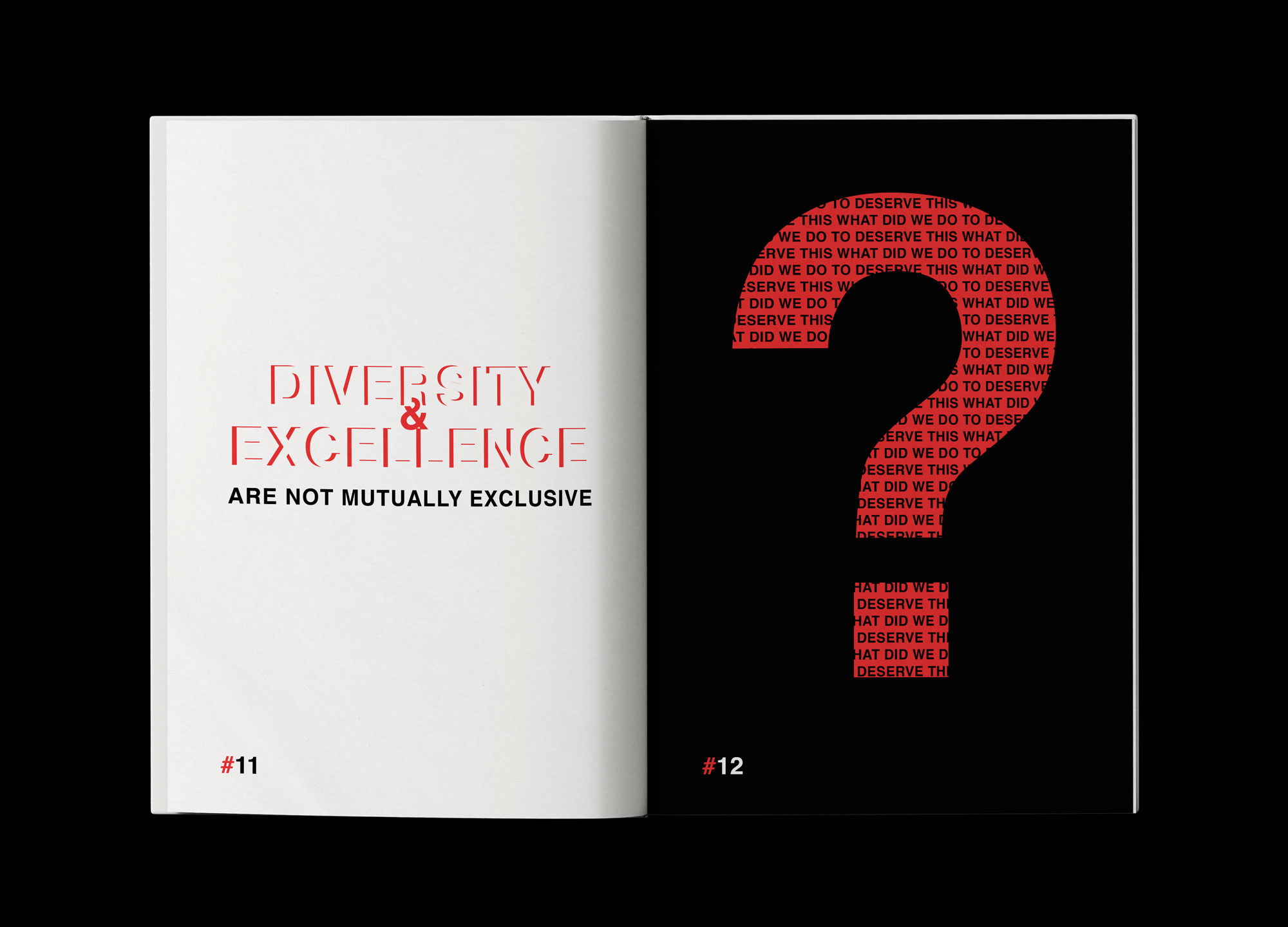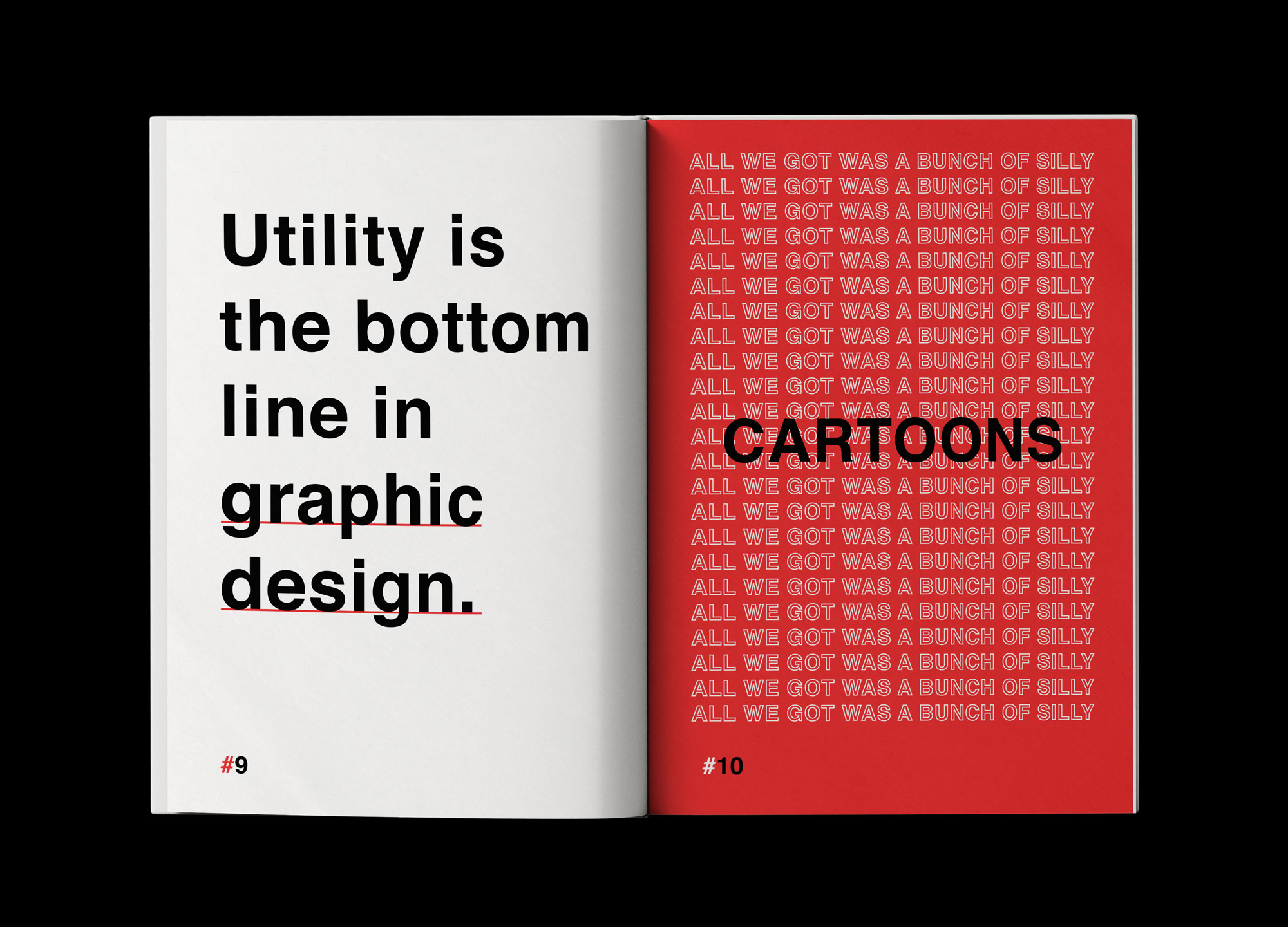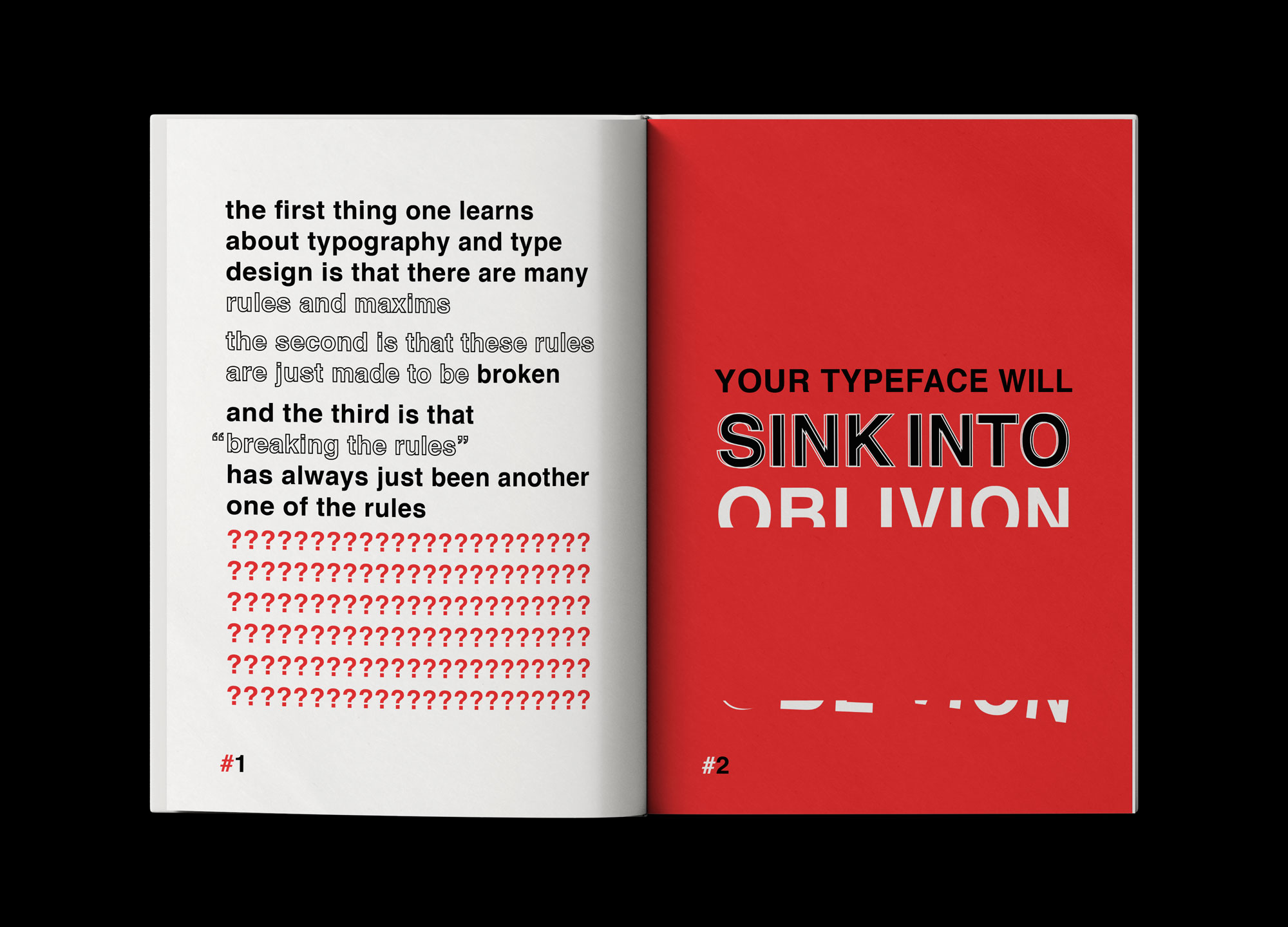 Amplifying Absurdity: Black and Red as Accent ColorsThe color palette of black and red serves multiple purposes. It accentuates the absurdity of the advice presented in the book, while also signaling the light-hearted and playful nature of the content. By employing only typography to create artwork, the design becomes constrained yet dynamic, leveraging the overlapping of type, the interplay of colors, and the manipulation of shapes and textures to create visually striking compositions.