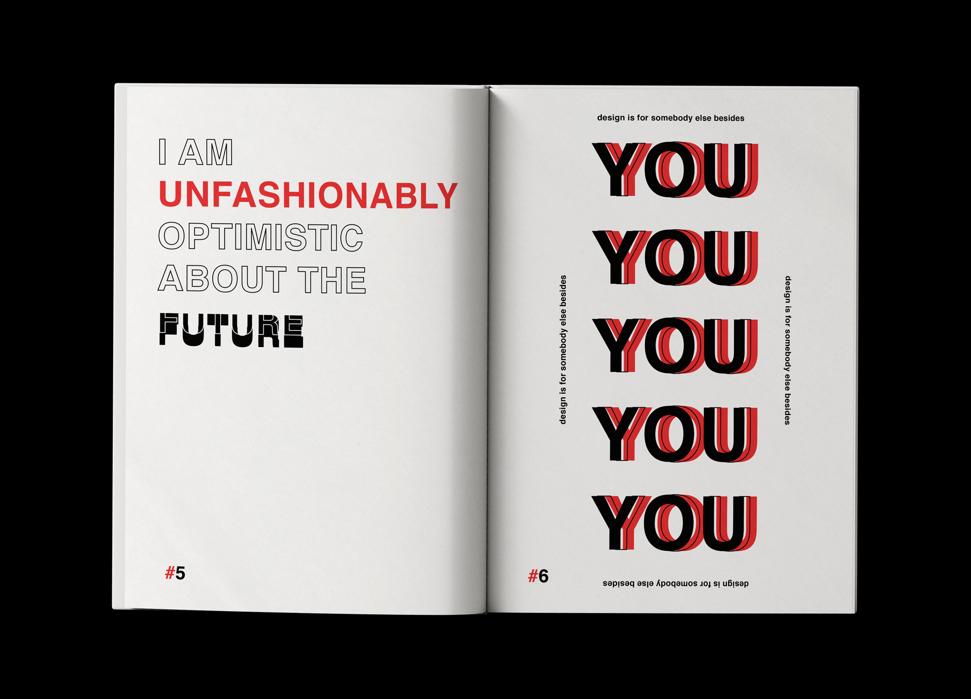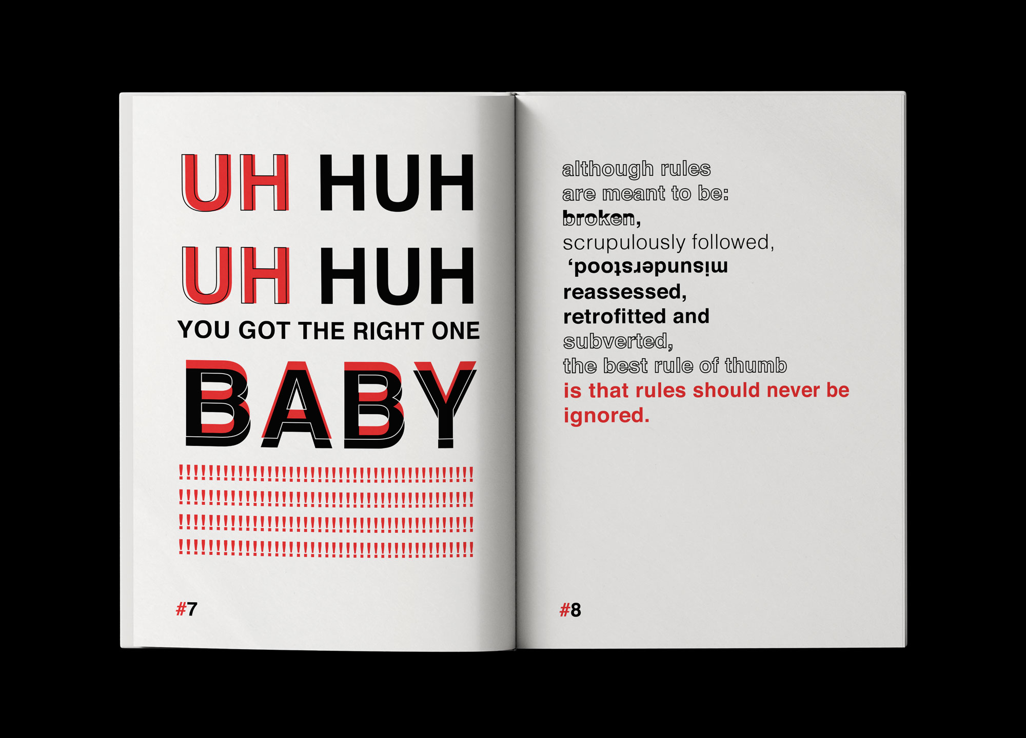 Foundational Inspiration: Jeffery Keedy’s Insightful Essays In my typography project, I drew inspiration from the thought-provoking essays of Jeffery Keedy, particularly “The Rules of Typography according to Crackpots Experts,” “Design Modernism 8.0,” and “The Global Styles.” This experimental book delves into typography as a means to interpret various quotes reflecting the author’s design philosophy, while also encouraging readers to embrace exploration and expressiveness in their typographic endeavors. Created exclusively using Adobe InDesign, this project aims to challenge conventions and embrace a Dadaist approach to design.