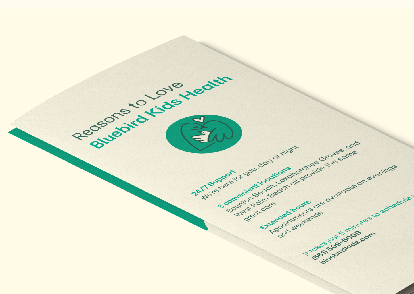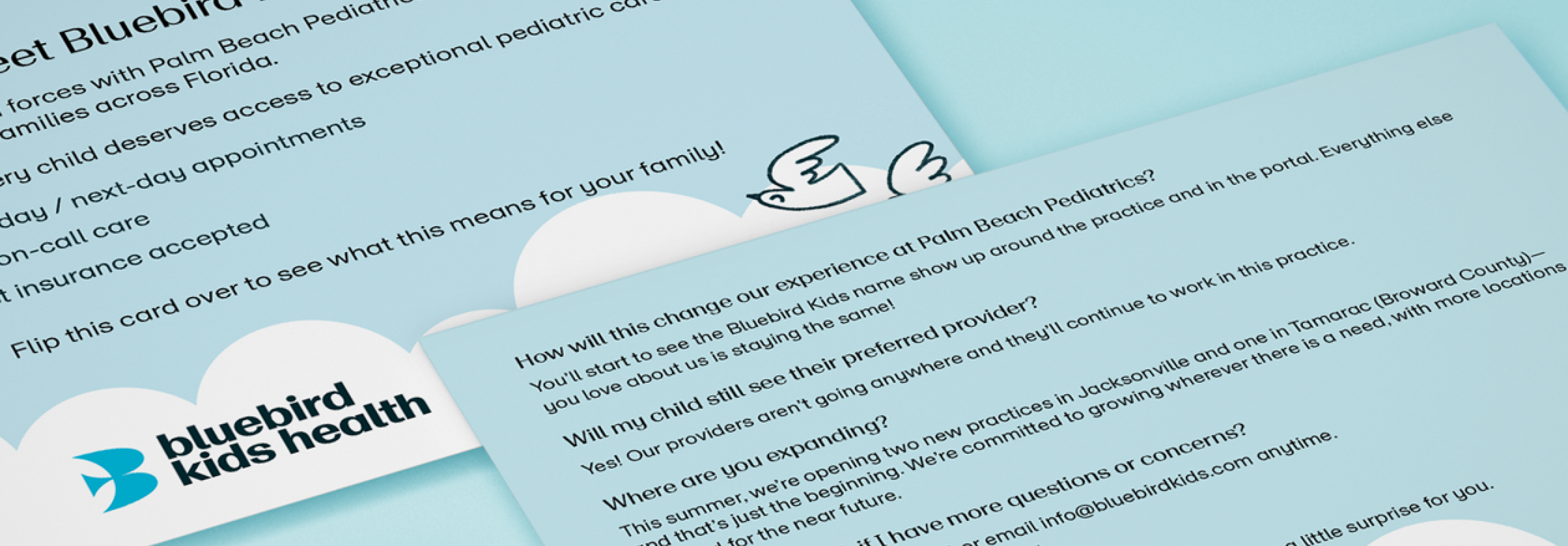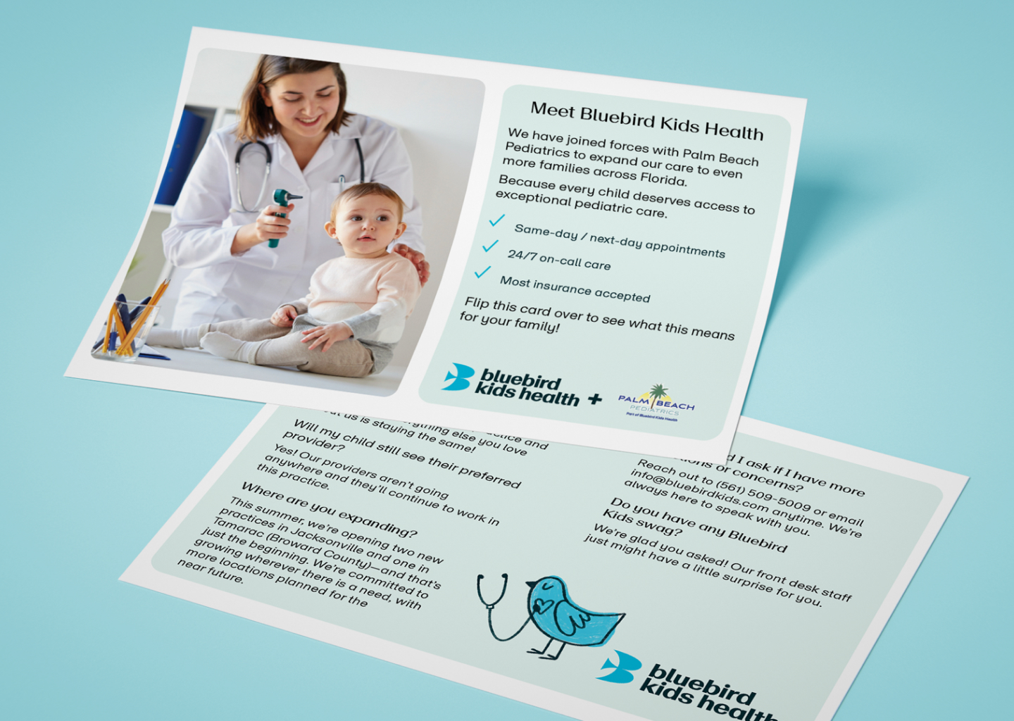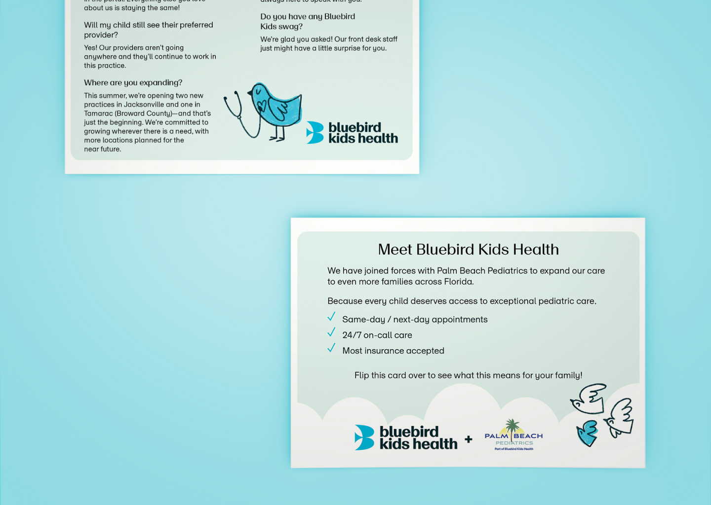 As part of the collateral, I developed a series of pamphlets that drew on the full breadth of Bluebirds Kid’s Health’s brand palette. By thoughtfully exploring different combinations of their identity colors, I was able to highlight the flexibility of the system while keeping the materials cohesive and recognizable. This experimentation not only brought variety and visual interest to the pamphlets but also demonstrated how the refreshed identity could adapt across different formats and audiences without losing its sense of unity.