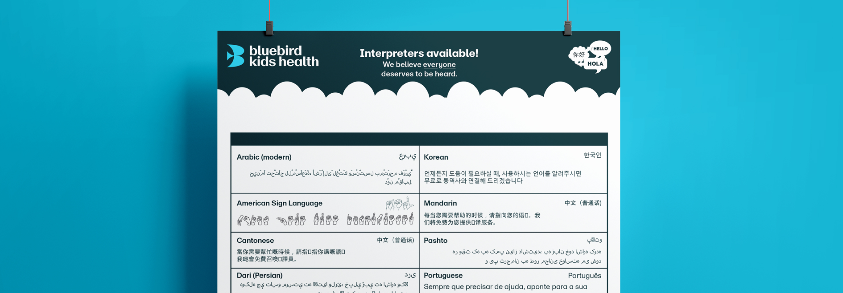 As part of the rebrand, I also worked on a set of posters that extended the organization’s message across multiple languages, ranging from American Sign Language to African and South Asian languages such as Hindi. The goal was to make the identity not only visually consistent but also culturally and linguistically accessible to the diverse families that Bluebirds Kid’s Health serves. By adapting the brand voice across these different contexts, the materials reflected the organization’s commitment to inclusivity while maintaining a unified look and feel.