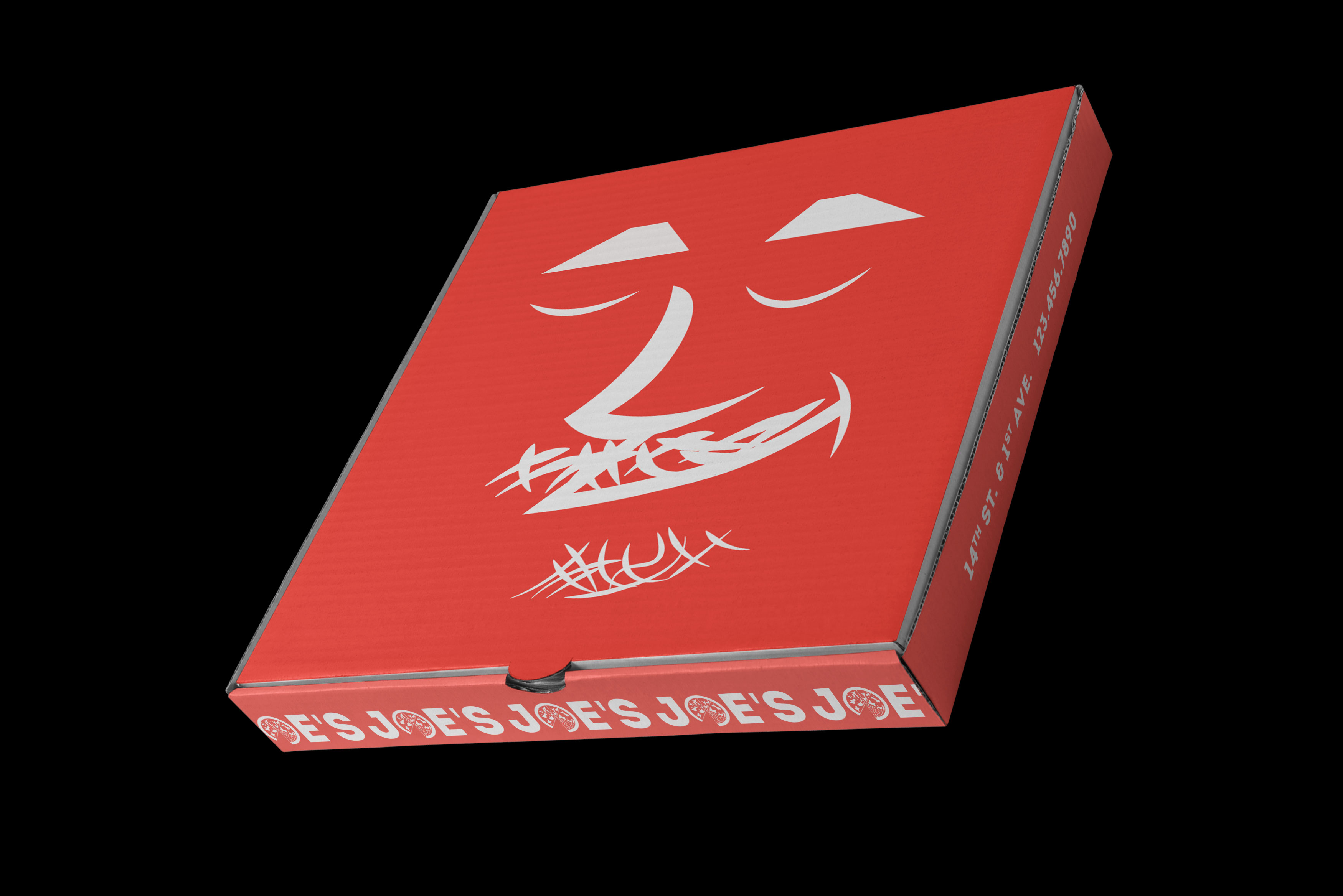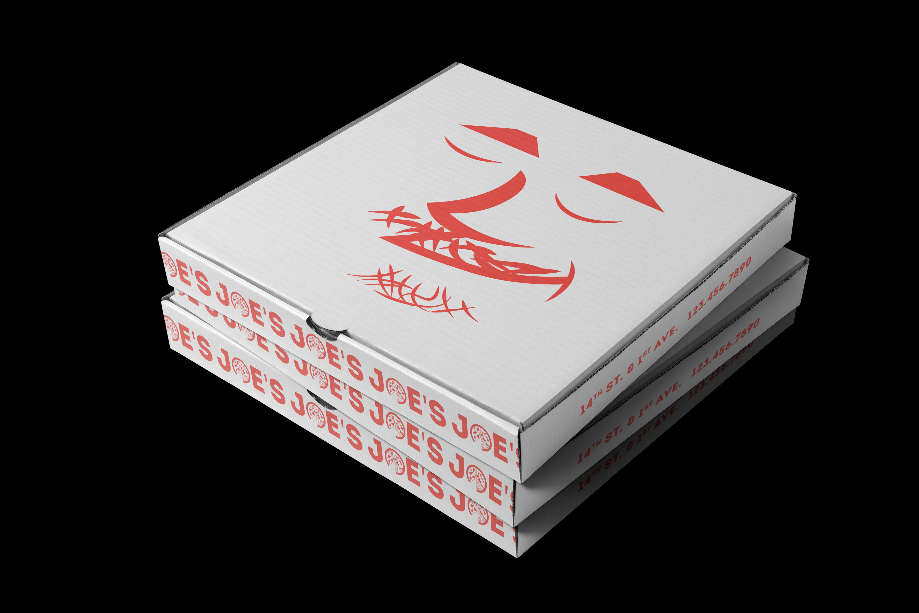 Pizza box mockups featuring the re-designed Joe’s logo.