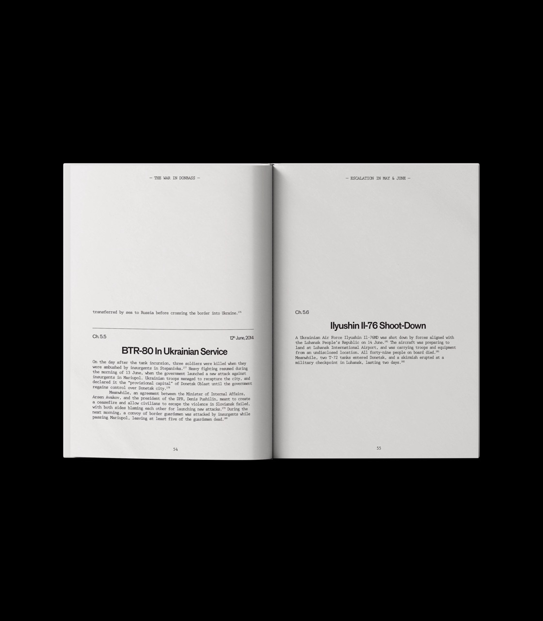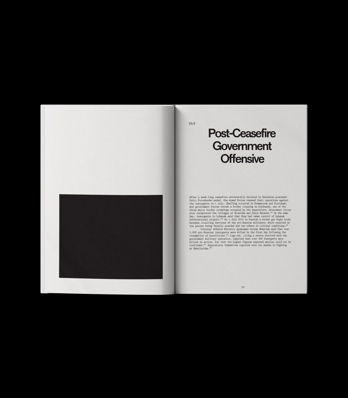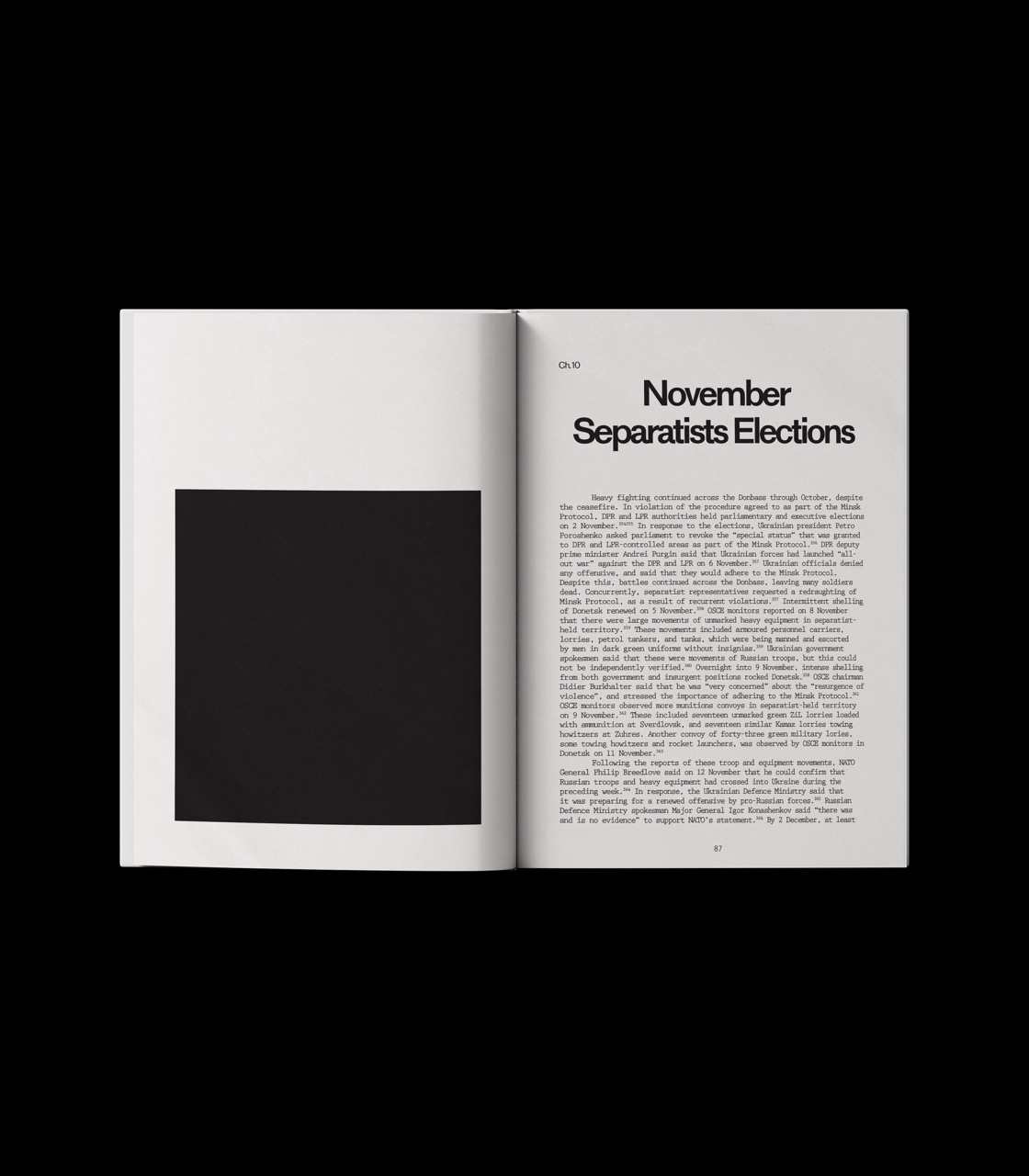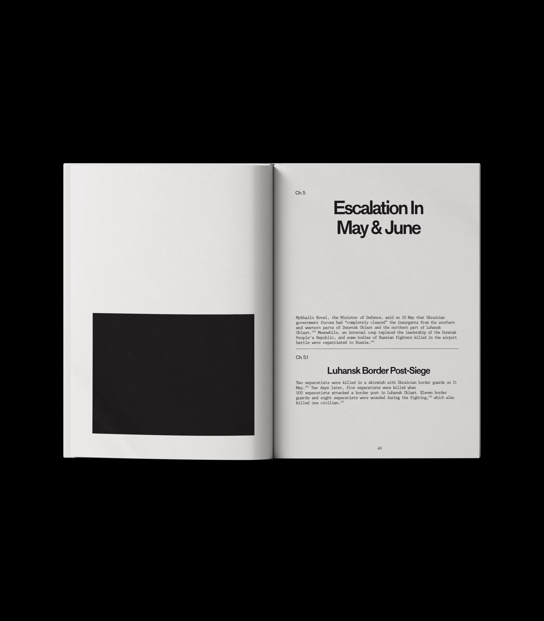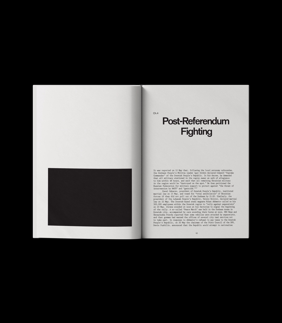The start of each chapter features a black block on the left. This serves as a visual device for the reader to observe the progressive annexation of Donbass.