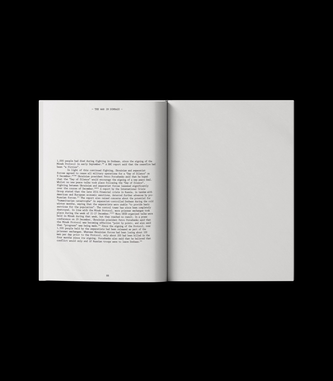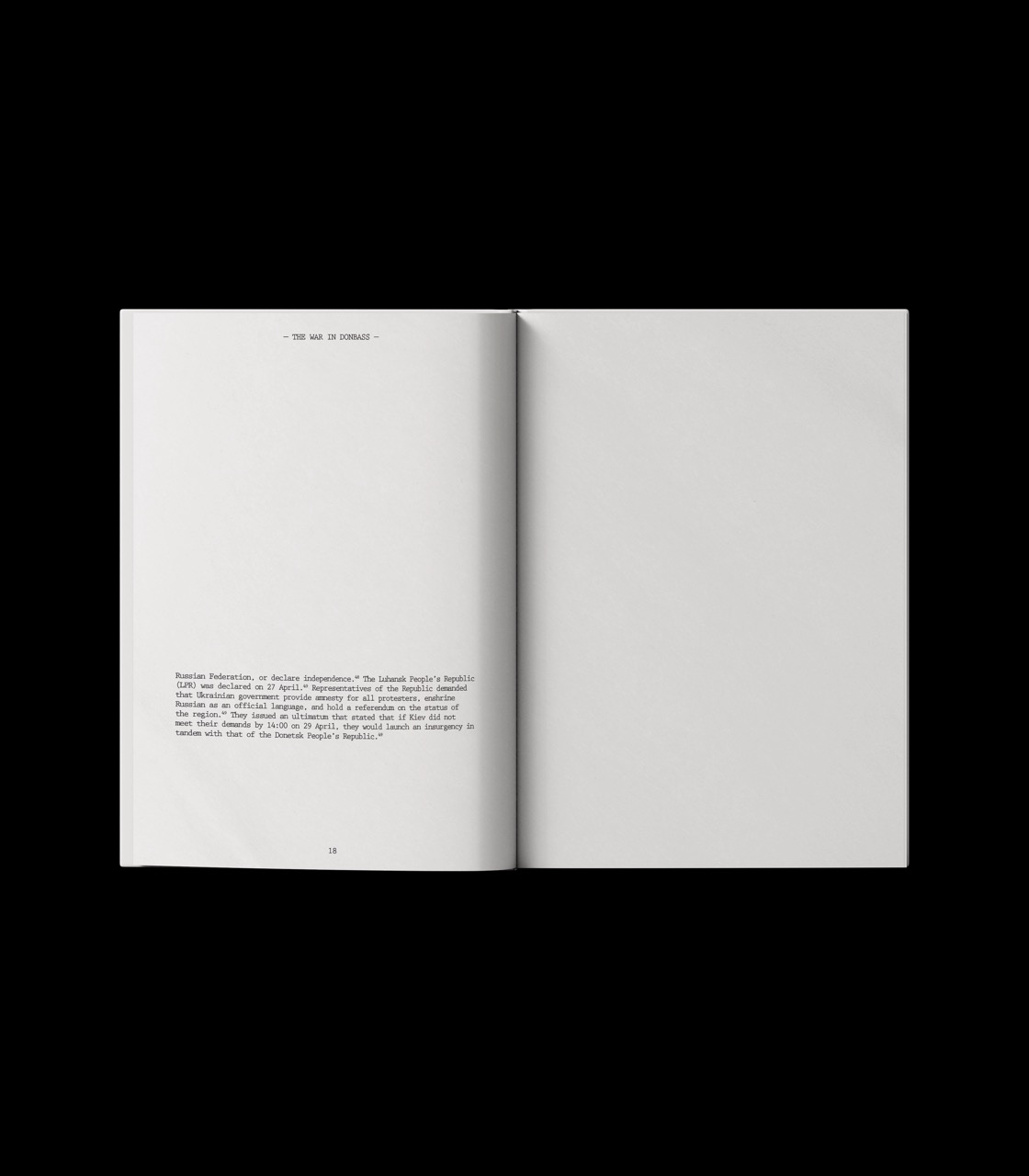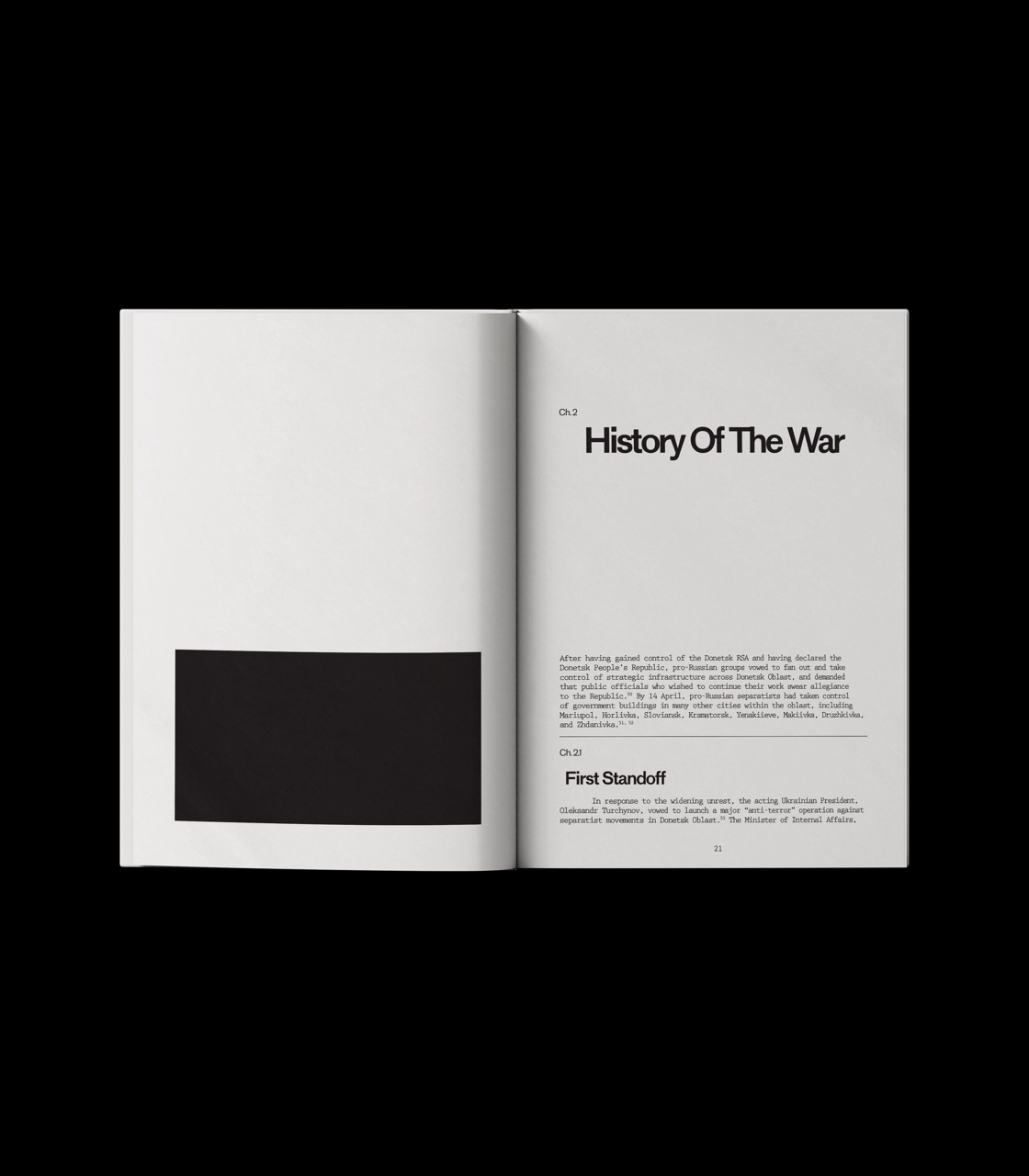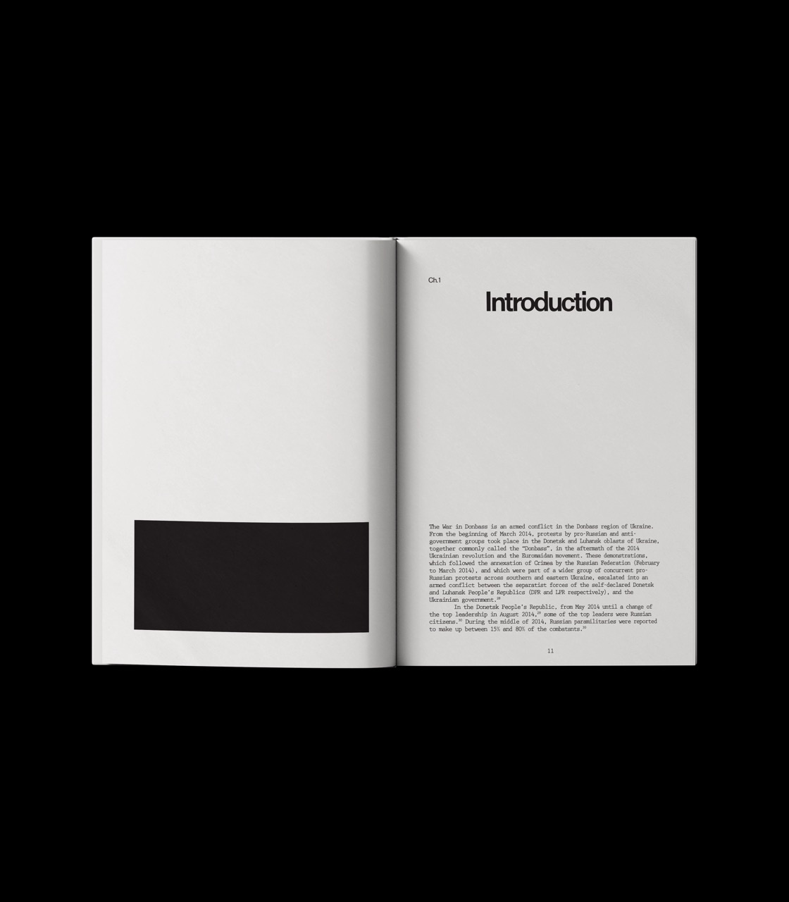 The War In Donbass is a typographic exploration into the annexation of the region of Donbass in Ukraine, by the Russian government. The book is designed in a progressive and exponential manner in that as the reader flips the pages, the text slowly creeps up. As each chapter progresses, the text rises to showcase this feeling of annexation. Moreover, this adds to the exponential nature of war–as the more time it takes, the worse the effects are, and they multiply. As the chapters progress, they get shorter and shorter as more text fills up the space.
