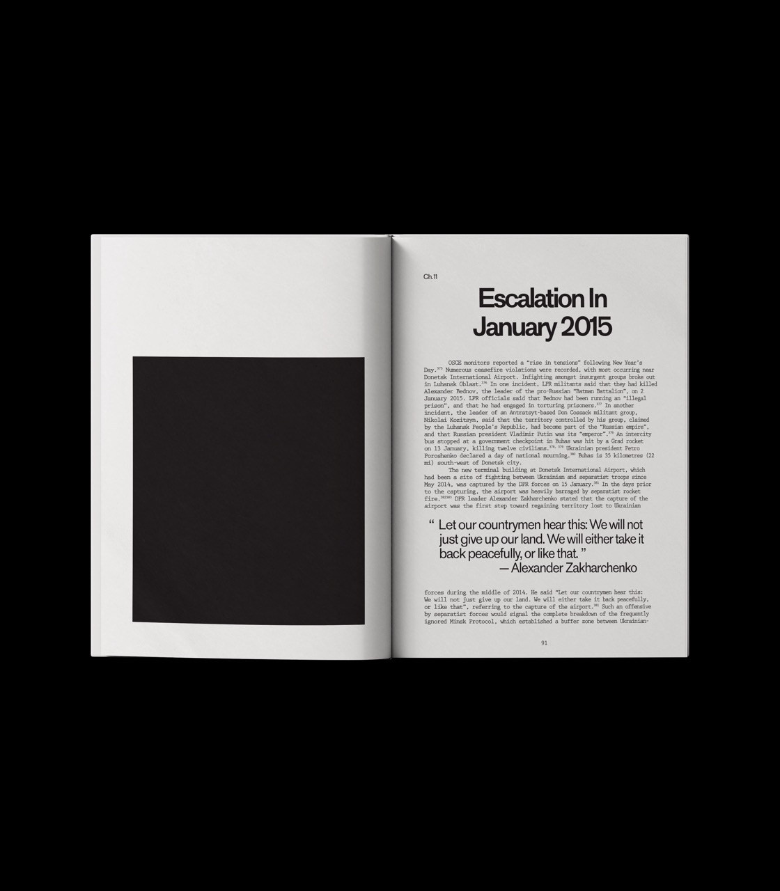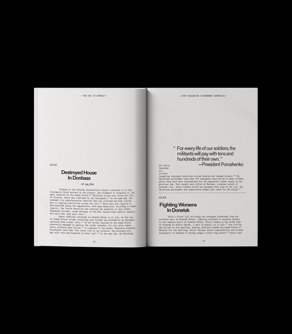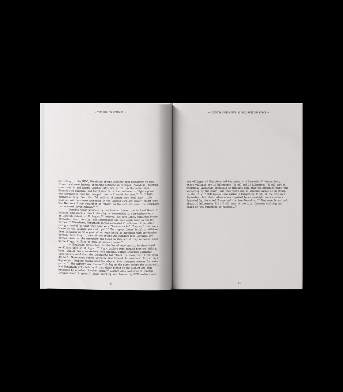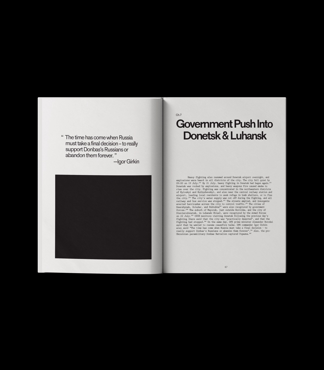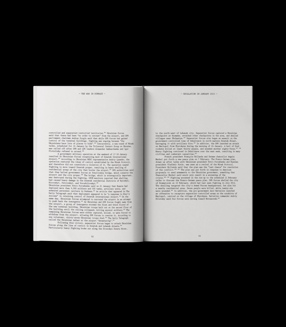 The War In Donbass is a typographic exploration into the annexation of the region of Donbass in Ukraine, by the Russian government. The book is designed in a progressive and exponential manner in that as the reader flips the pages, the text slowly creeps up. As each chapter progresses, the text rises to showcase this feeling of annexation. Moreover, this adds to the exponential nature of war–as the more time it takes, the worse the effects are, and they multiply. As the chapters progress, they get shorter and shorter as more text fills up the space.