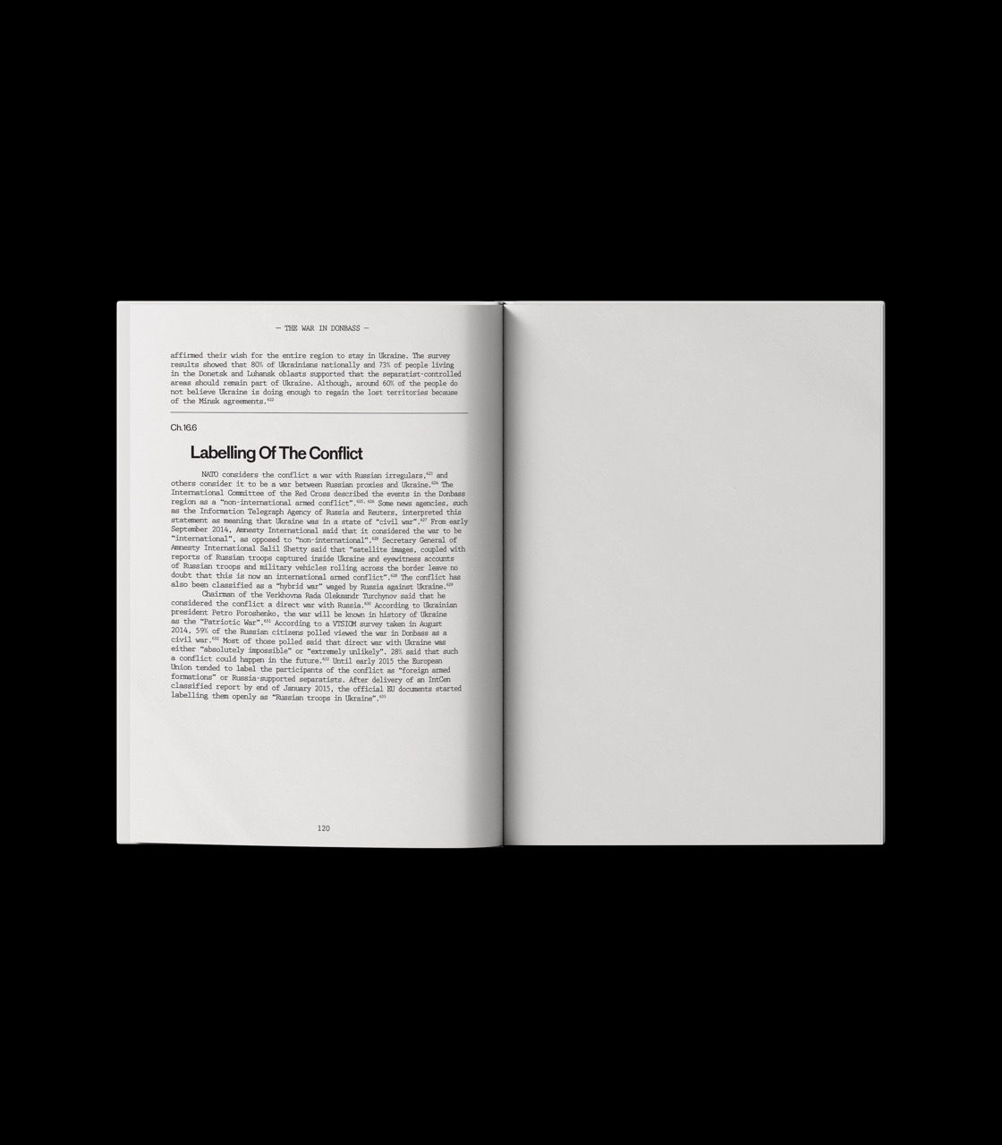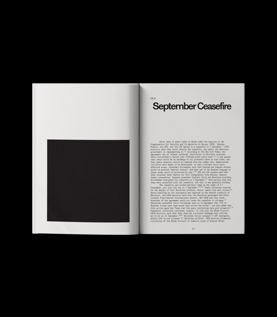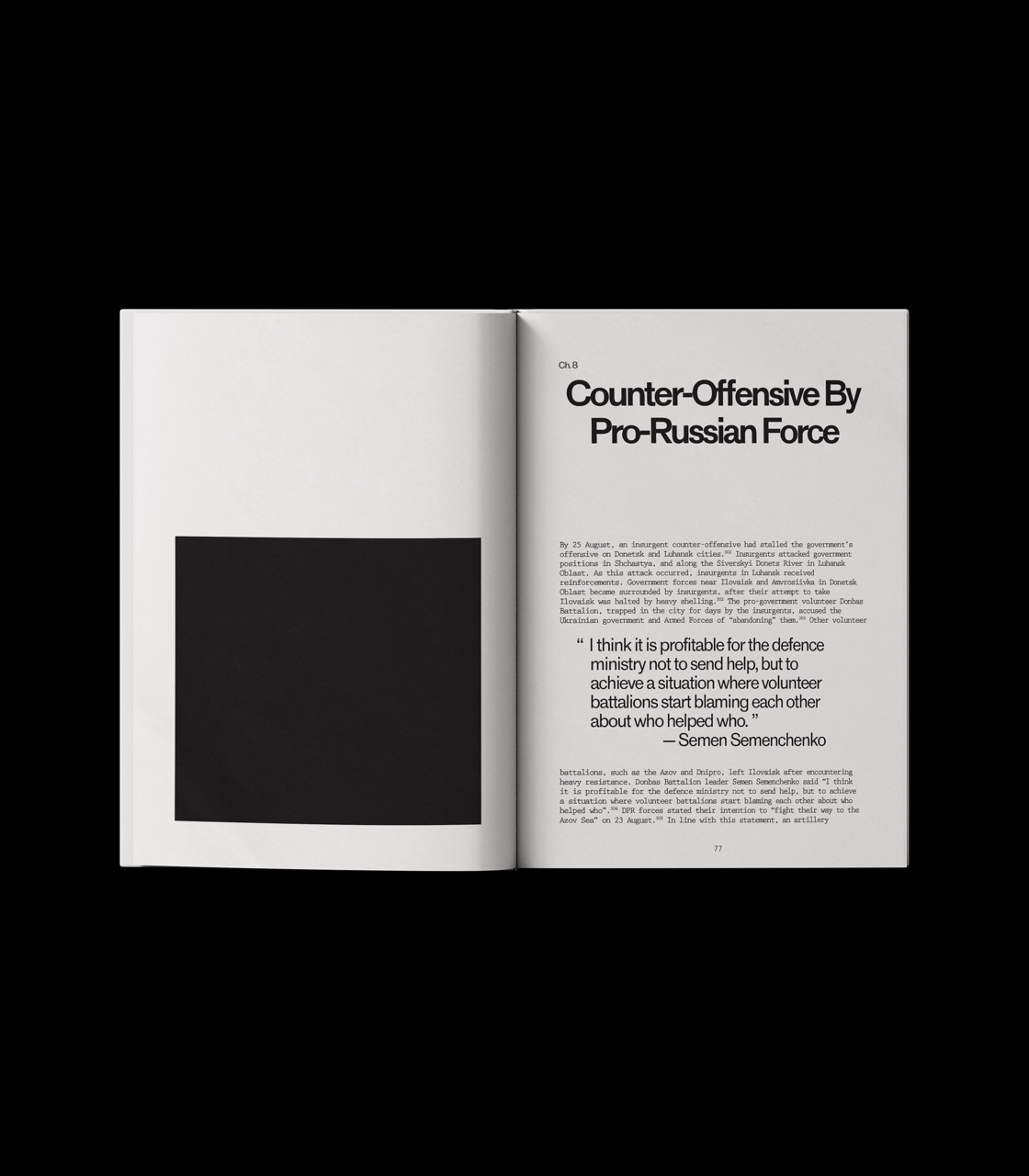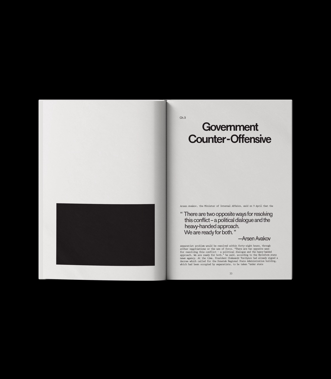 The War In Donbass is a typographic exploration into the annexation of the region of Donbass in Ukraine, by the Russian government. The book is designed in a progressive and exponential manner in that as the reader flips the pages, the text slowly creeps up. As each chapter progresses, the text rises to showcase this feeling of annexation. Moreover, this adds to the exponential nature of war–as the more time it takes, the worse the effects are, and they multiply. As the chapters progress, they get shorter and shorter as more text fills up the space.