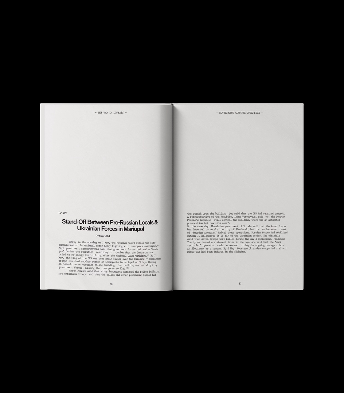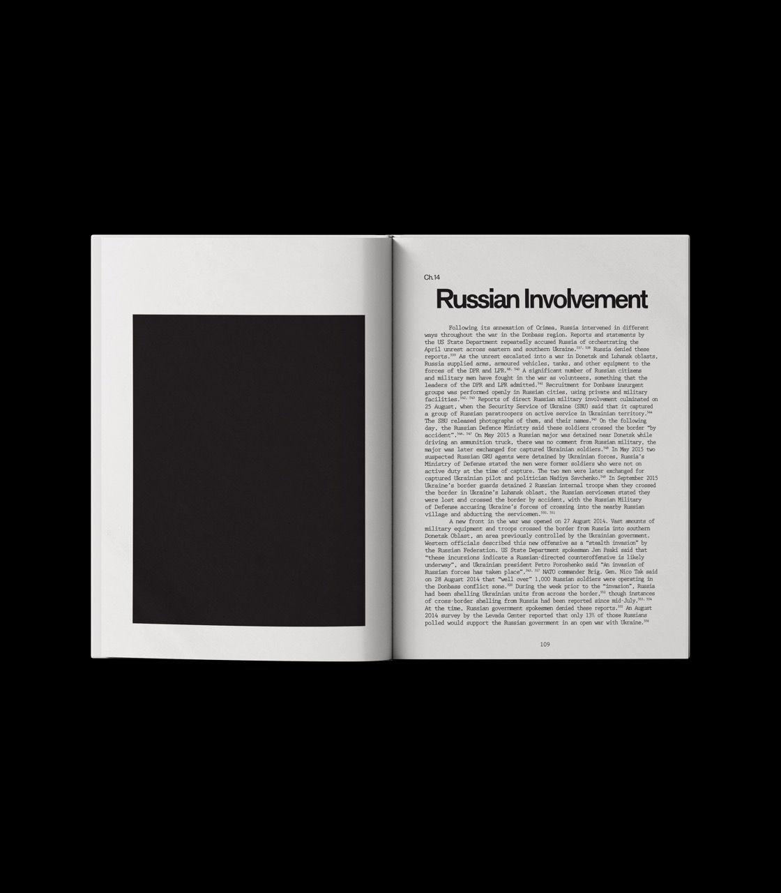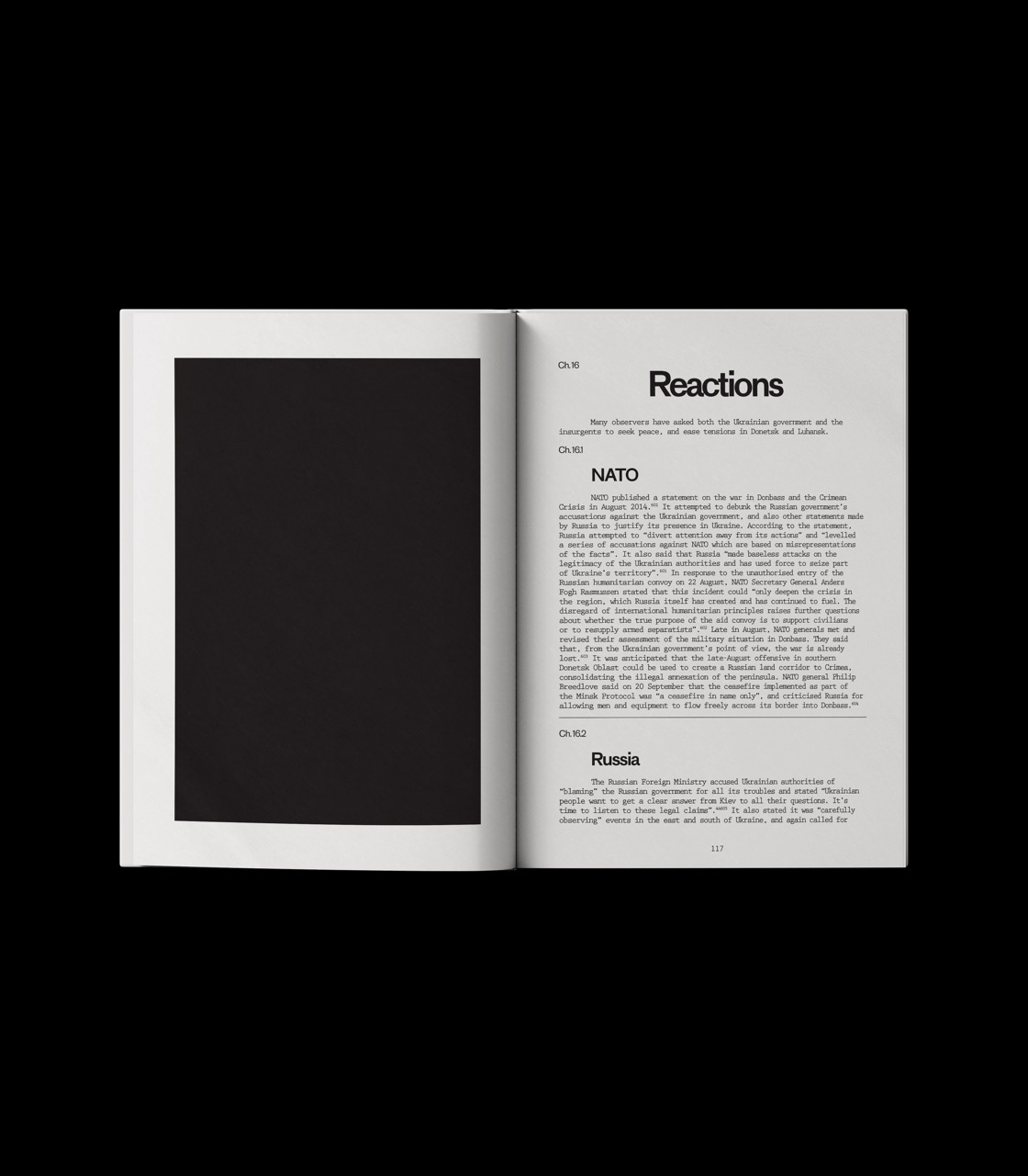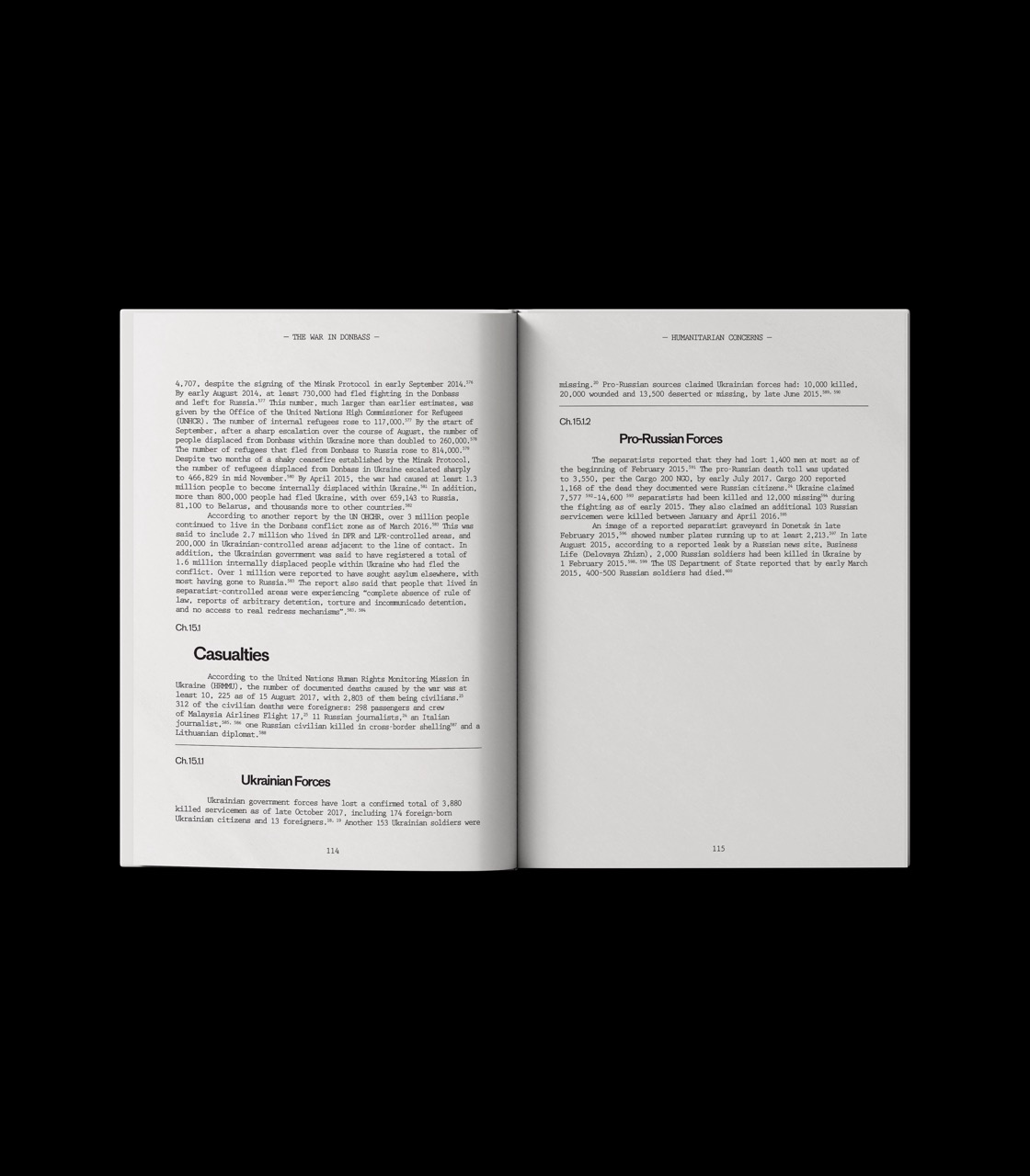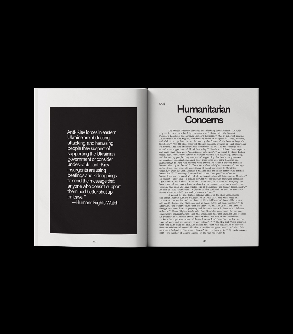 The War In Donbass is a typographic exploration into the annexation of the region of Donbass in Ukraine, by the Russian government. The book is designed in a progressive and exponential manner in that as the reader flips the pages, the text slowly creeps up. As each chapter progresses, the text rises to showcase this feeling of annexation. Moreover, this adds to the exponential nature of war–as the more time it takes, the worse the effects are, and they multiply. As the chapters progress, they get shorter and shorter as more text fills up the space.