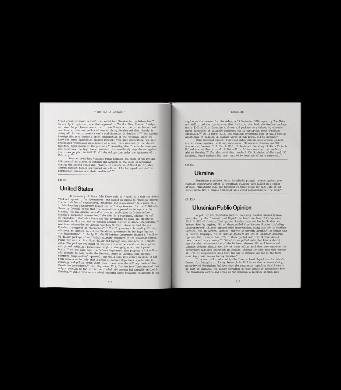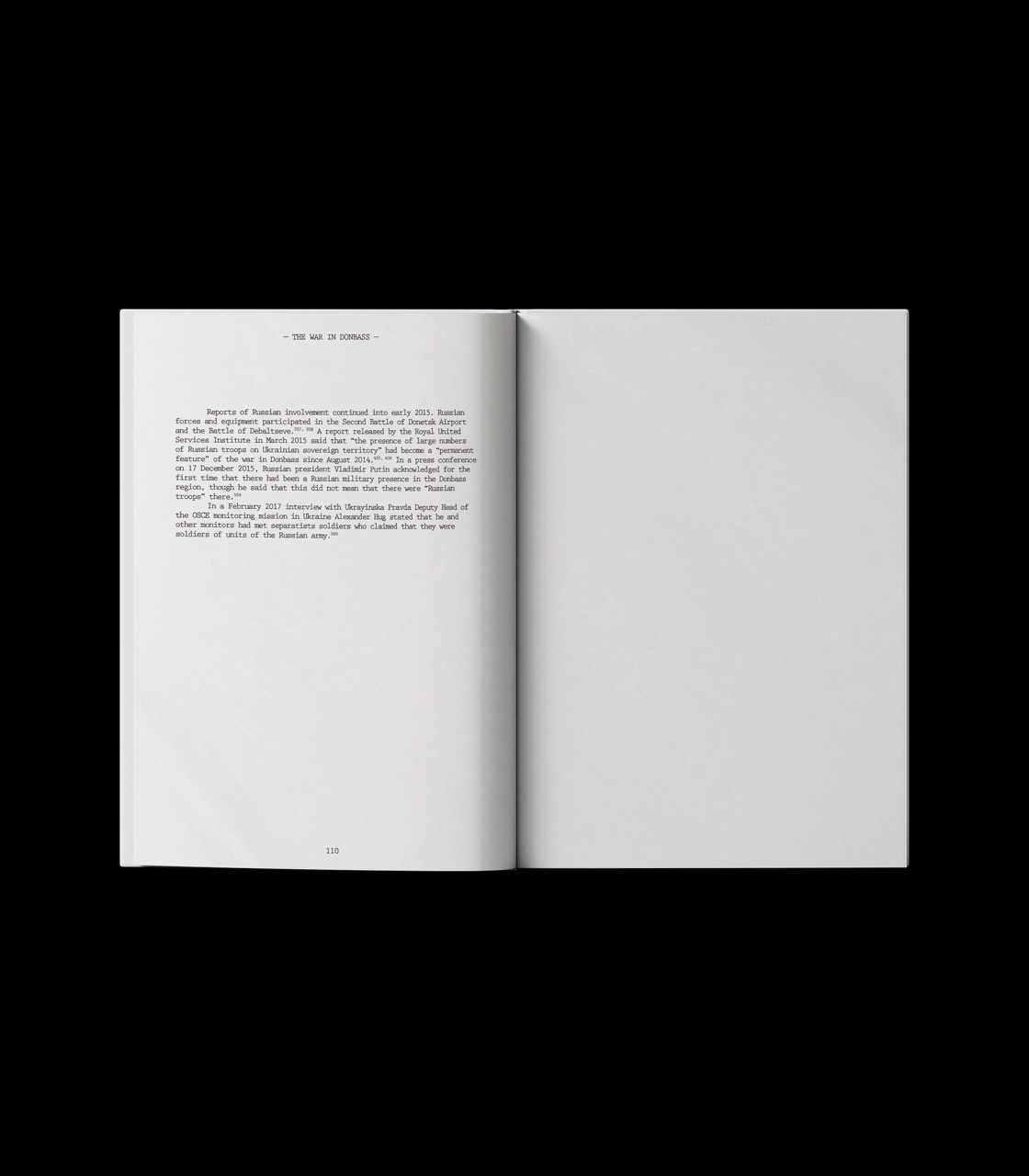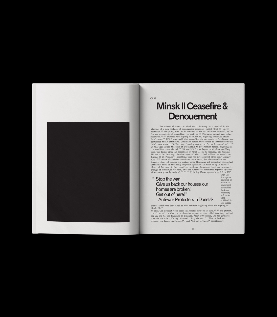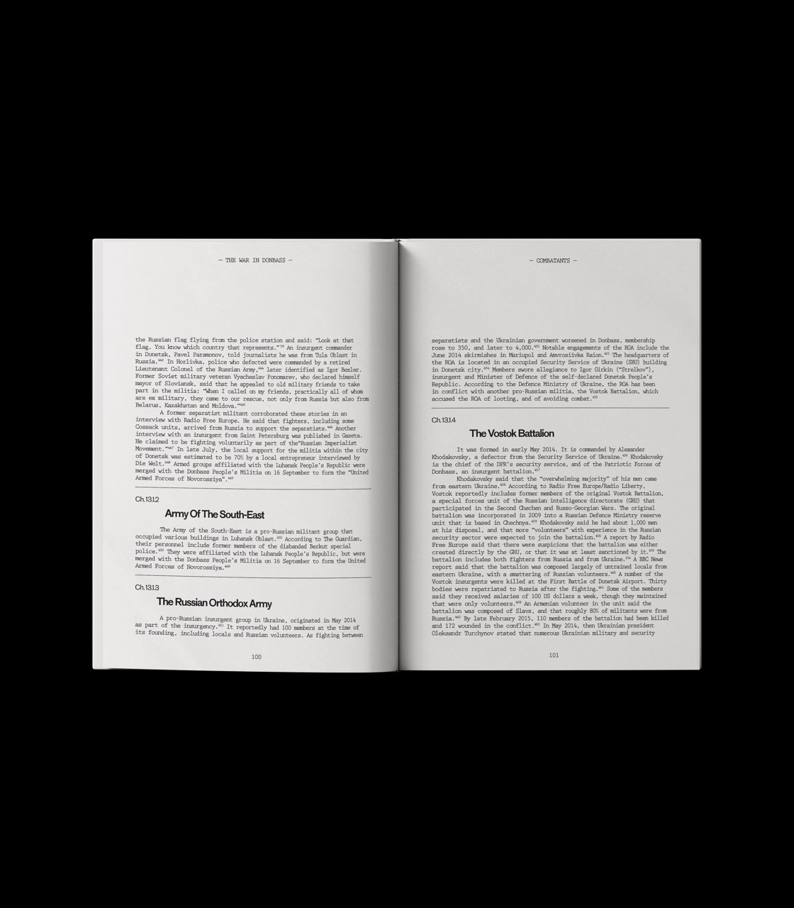 The War In Donbass is a typographic exploration into the annexation of the region of Donbass in Ukraine, by the Russian government. The book is designed in a progressive and exponential manner in that as the reader flips the pages, the text slowly creeps up. As each chapter progresses, the text rises to showcase this feeling of annexation. Moreover, this adds to the exponential nature of war–as the more time it takes, the worse the effects are, and they multiply. As the chapters progress, they get shorter and shorter as more text fills up the space.