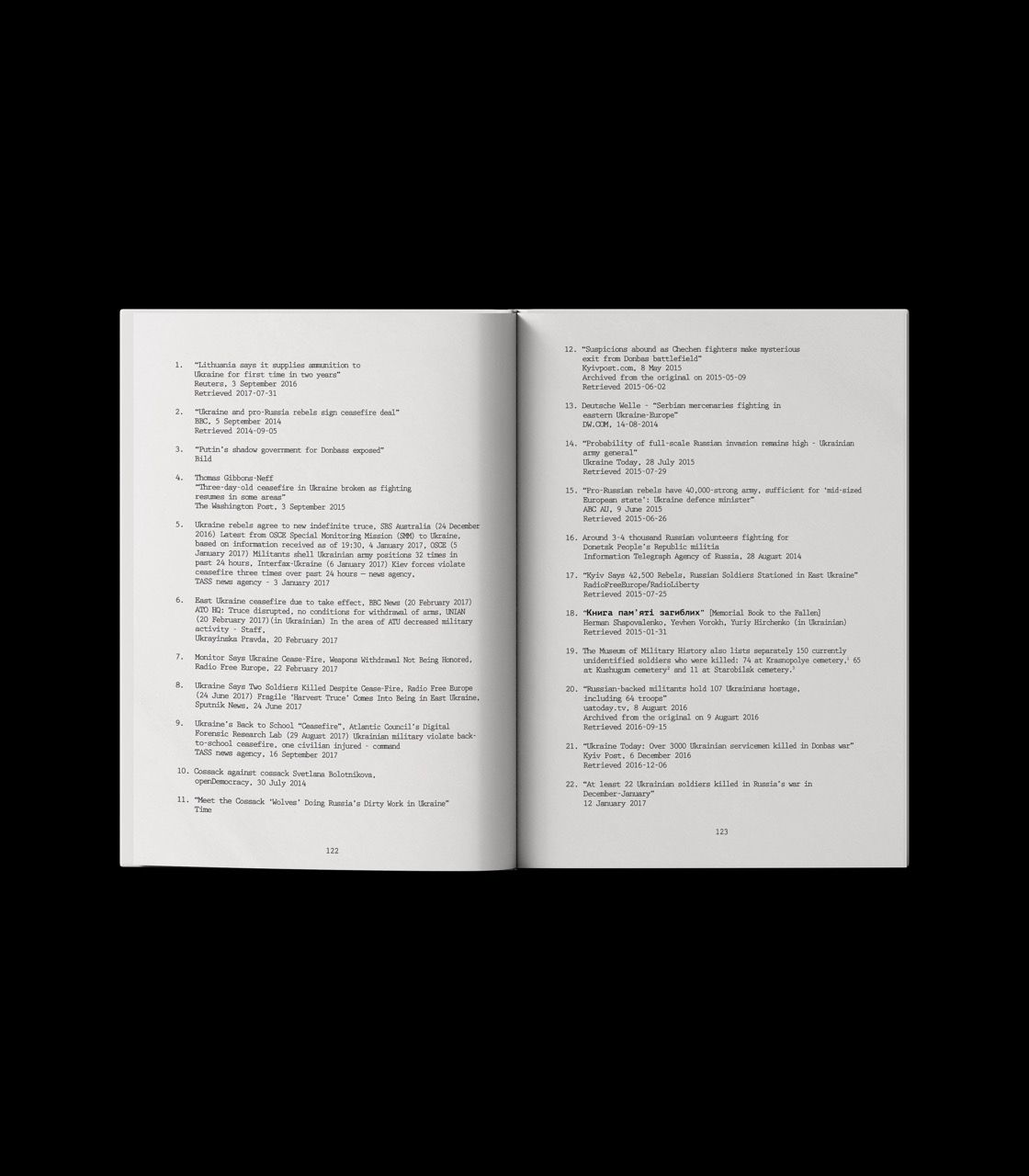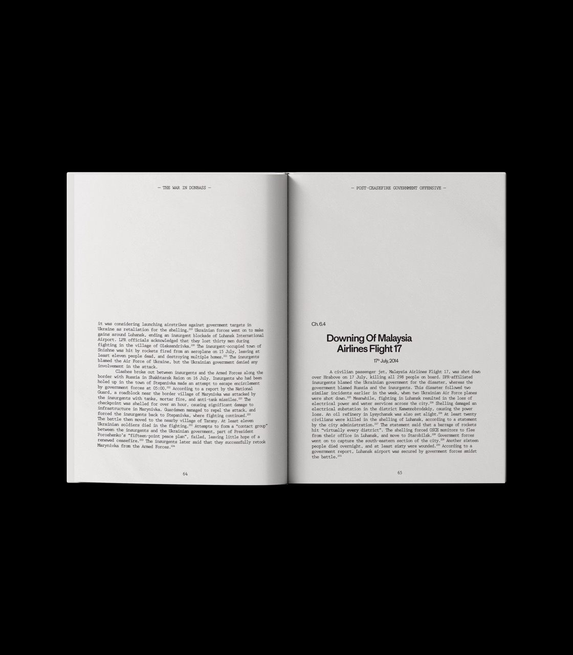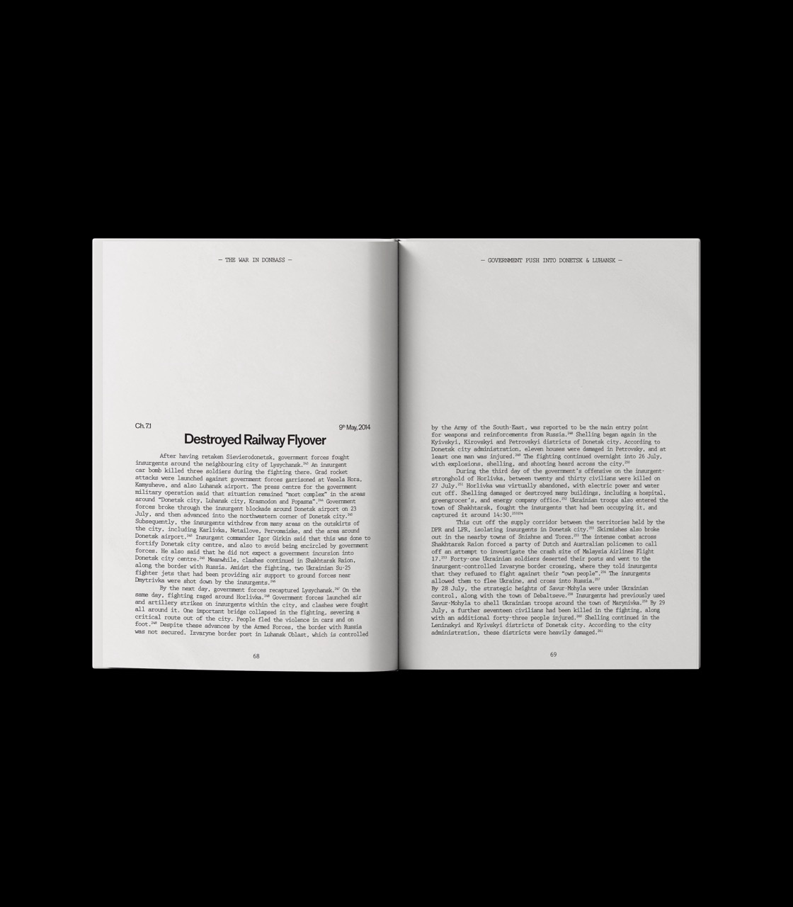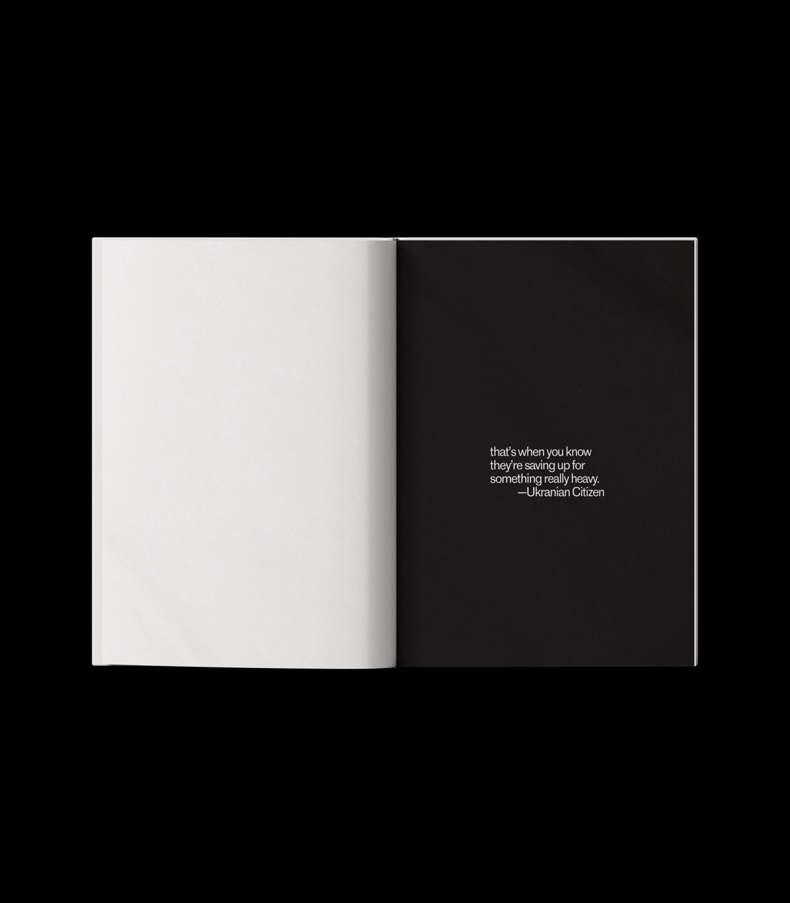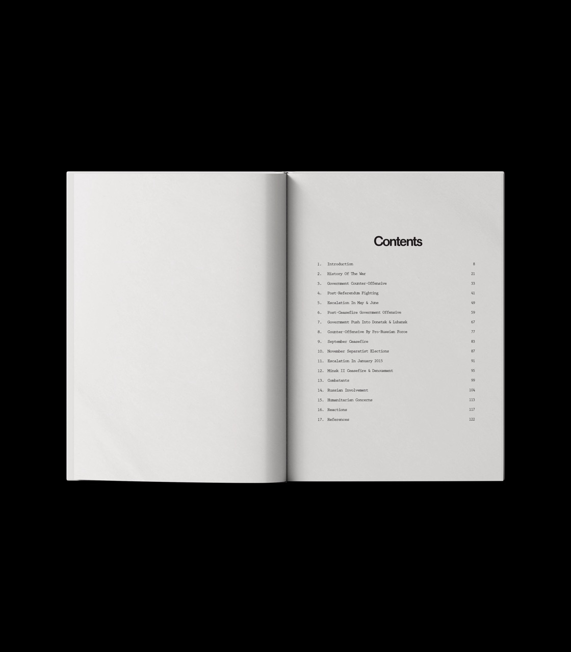 The War In Donbass is a typographic exploration into the annexation of the region of Donbass in Ukraine, by the Russian government. The book is designed in a progressive and exponential manner in that as the reader flips the pages, the text slowly creeps up. As each chapter progresses, the text rises to showcase this feeling of annexation. Moreover, this adds to the exponential nature of war–as the more time it takes, the worse the effects are, and they multiply. As the chapters progress, they get shorter and shorter as more text fills up the space.